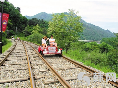铁路自行车分两人用和四人用,使用便捷,灵活自如。出发前,先扣好安全带,然后每车慢慢前进,等到与前车相隔适当的距离时便可全速前进,十分刺激。铁路自行车全长约需时50分钟,但不要以为需要大量体力,因为四轮已固定于路轨上,而铁路又多是斜路,只要出点力一踏,车子已飞快前进,这时心也跟着飞起来。还因为沿途景色十分迷人,翠绿山林,清澈的溪水,峰回路转间,又变成了成片的稻田,山里村庄,空气清新,阳光明媚,既刺激,又享受。在穿过山洞时又有别样的惊喜,山洞内的灯光随着韩国最流行的音乐闪烁着。此时是春夏漫山翠绿、流水淙淙,叫人心旷神怡。想着若是秋天应该会更加迷人,可欣赏到漫山红枫;冬天的雪景更是浪漫。