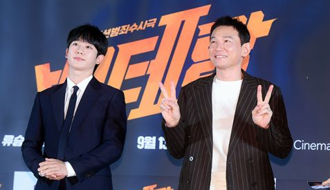 全新动作电影《辣手警探2》今天於首尔CGV龙山I'Park购物中心举行制作发布会,演员黄晸珉和丁海寅以及导演柳承完出席现场,为活动增添光彩。