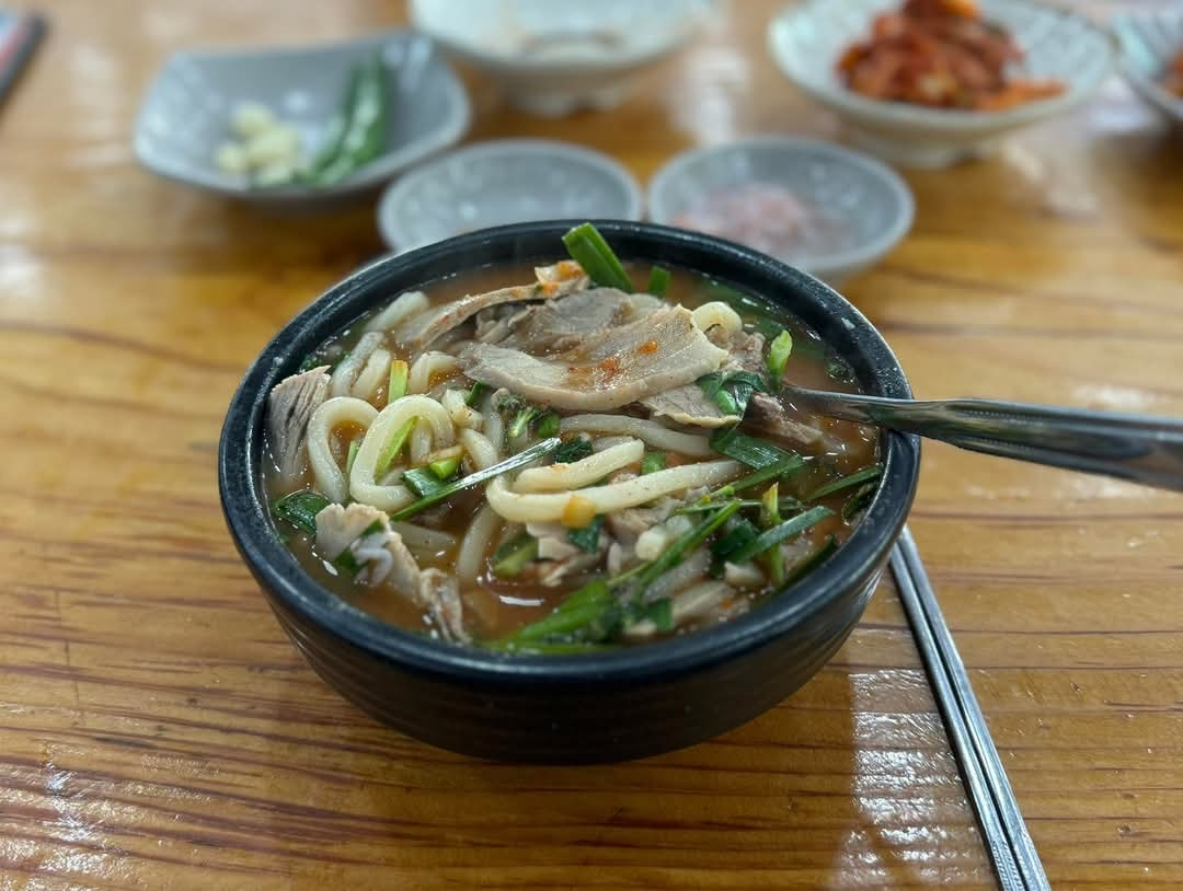 韩网讯/有名的釜山,陕川一流猪肉汤饭,因为是冷冻乌冬面,所以口感非常饱满。