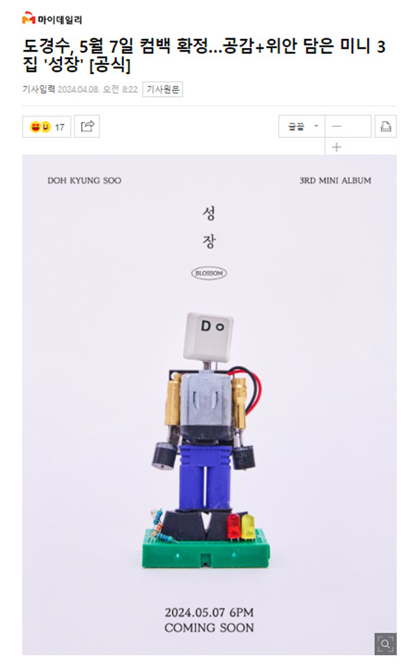 作为歌手回归!都暻秀将于5月7日发行迷你3辑《成长》