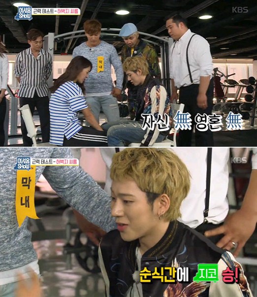 6月17日KBS 2TV综艺节目《欢迎SHOW》播出第7期,成员们与作为第四项才能商品的男团Block B成员ZICO、女团Sistar等相见。节目中,“直播精灵”金世正在与孝琳、宝拉的大腿摔跤游戏中获得胜利,展现出令人惊讶的强劲腿力。随后,金钟国提议让ZICO与金世正进行对决。尽管在比赛开始前,ZICO毫无自信地说道道:“我会输的。”但最后ZICO依然获得了胜利。值得注意的是,为了不输给金世正,ZICO使出了浑身力气应战。比赛结束后,他害羞地向节目组拜托道:“我是不是太认真了?请帮我剪掉这段吧。”引起了众人的一阵爆笑。