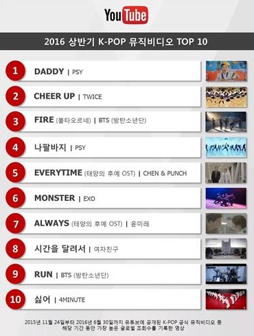 据详细数据,TWICE的歌曲《CHEER UP》排在了第二位;防弹少年团的歌曲《Fire》位居第三。排在第四至第七位的歌曲分别为PSY的《喇叭裤》、CHEN与Punch的《Everytime》、EXO的《Monster》及尹未来的《ALWAYS》。值得一提的是,KBS 2TV水木剧《太阳的后裔》OST中有两首歌曲(《Everytime》、《ALWAYS》)入榜,而EXO则凭借新曲《Monster》在最短时间里杀进了前十。
