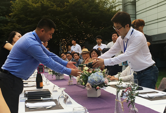中国润利达工贸集团总经理刘明与(株)Hans Gallery韩国汉斯集团全荣哲社长互倒香槟庆祝活动圆满成功