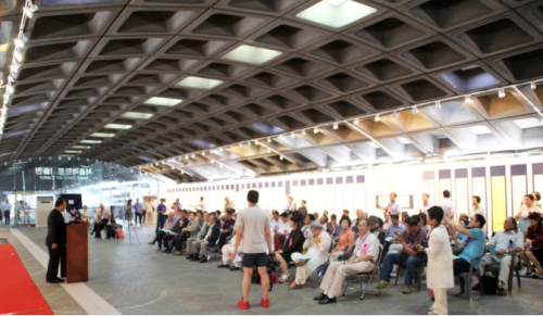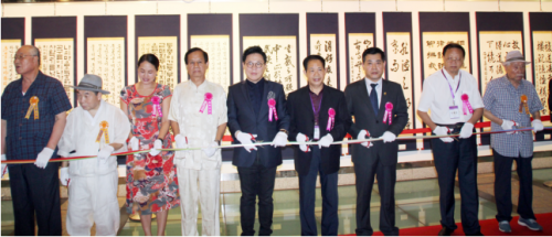 (2016.8.19中日韩三国书画家在开幕式现场剪彩,粉胸花为中方代表)