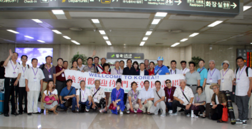 (中方书画家代表初到韩国机场受到韩国国际文化协会的热烈欢迎)