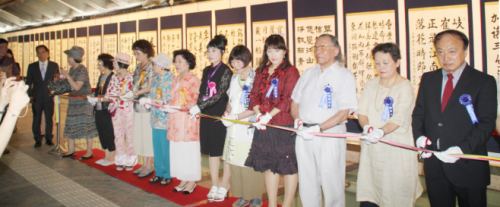 (日韩书画家代表在剪彩现场,黄胸花为中方,蓝胸花为日方代表)
