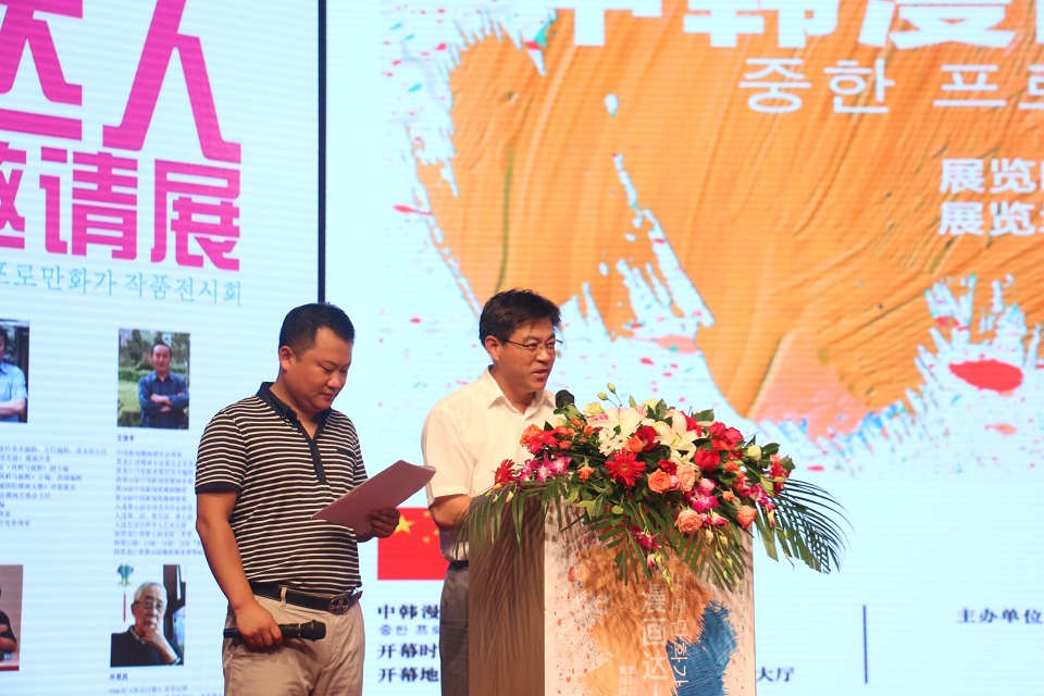 徐鹏飞对漫画展给予了高度评价并祝愿漫画展获得圆满成功。权荣燮表达了对中韩两国漫画家交流的渴望,并感谢青岛农业大学为本次展会提供的大力支持。