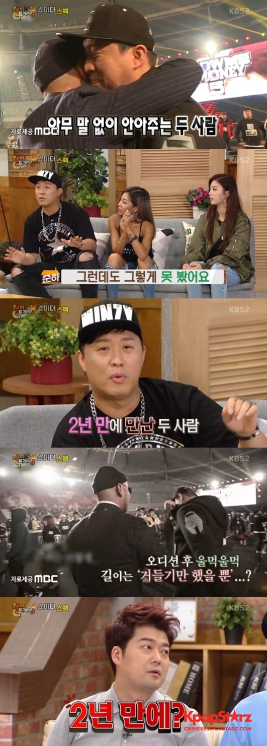 郑俊河谈《SMTM》与吉紧紧相拥一事。在昨日(8日)播出的KBS2TV综艺节目《Happy Together3》中,郑俊河、San E、Jessi等作为嘉宾出演了"Show me the swag"特辑。据悉,郑俊河曾因为MBC综艺节目《无限挑战》特辑参加了Mnet《Show Me The Money》。当时,郑俊河与吉的深情相拥,还一度成为了大家热议的话题。Advertisement 当天,郑俊河表示:"当时,许多方面的情绪、曾经的苦闷都涌了上来。我和吉已经超过两年没见面了,在小区内我们的家只相隔50m,却都没能见到,他见到我们也有一点那个..."之后,谈到被要求进行安可公演,郑俊河说道:"当时只想想就觉得很紧张。"