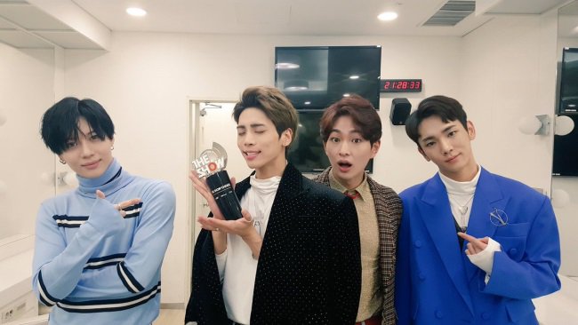 公开的认证照中,珉豪因为行程的关係而不在,四位成员在待机室留下与奖座的合照,而这是SHINee以《1of1》回归后,获得的首个一位。