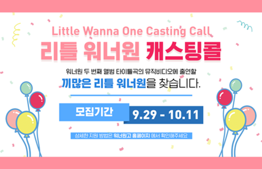 Wanna One方面29日通过官方SNS正式发布了公开选拔“Little Wanna One”的公告,报名日期为9月29日至10月11日。Wanna One方面将通过此次活动选拔和成员相像的11名儿童,在新专辑主打歌MV中饰演童年Wanna One。