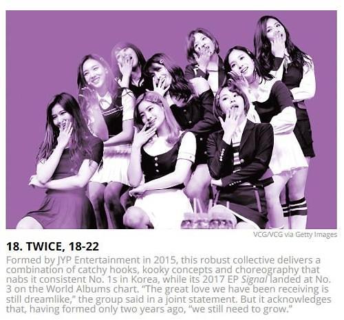 公告牌表示,TWICE凭借朗朗上口的副歌、独特的风格及舞蹈在韩国稳居榜单冠军宝座,该组合第四张迷你专辑《SIGNAL》在公告牌全球专辑榜单上位居第三。