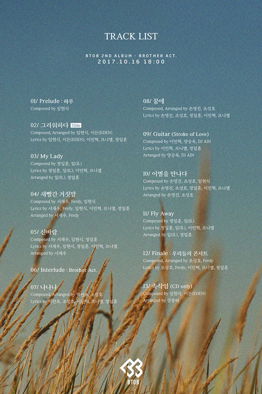 BTOB方面于10日通过官方SNS公开了即将于16日发行的第二张迷你专辑《Brother Act.》全曲歌单。新专辑共收录了包括主打歌《想念》(暂译)在内的13首歌曲,展现了BTOB代表性的感性抒情曲风的主打歌《想念》表达了对分手恋人真挚的想念之情。值得一提的是,多次担任BTOB专辑制作的成员任炫植此次同样全面参与了新专辑的作词、作曲和制作,创作才华有望再次得到认可。