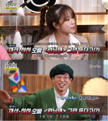 周日录影,可以感受成员们似乎活力不足,但讲到《Running Man》就突然激动起来!先是郑埻夏强调自己顺利拍摄了美珠担任MC的节目《TMI SHOW》:幸好是《Running Man》拍摄前一天,前一天!刘在锡愣了几秒后说:为什么总在这里提《Running Man》?《Running Man》制作组和PD也很……