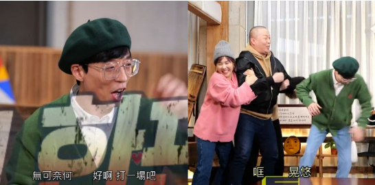 当刘在锡讲到《Running Man》因为有存档而不用像《玩什么好呢?》抽空补录时,连制作组都忍不住叹气,刘在锡听了大喊:好啊,来打一场!美珠马上站起来与他对峙:「打一场吧!是《Running Man》组的吗?」抱怨组接著又开始逼刘在锡站队,小孩子似的打闹起来……