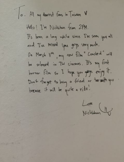 已从泰国返回韩国入住防疫旅馆的尼坤,行程满档仍不忘台湾粉丝,献上亲自手写信温暖问候台湾影迷,尼坤写下:台湾的粉丝朋友们大家好,我是2PM的尼坤,已经很久没见到你们,我也非常想念大家,3月11日在台湾上映的《凝弑》,是我的首部恐怖电影作品,希望大家会喜欢!记得要找几位朋友陪你一起观赏,《凝弑》保证会让你吓破胆,永生难忘!《凝弑》现正热映中。