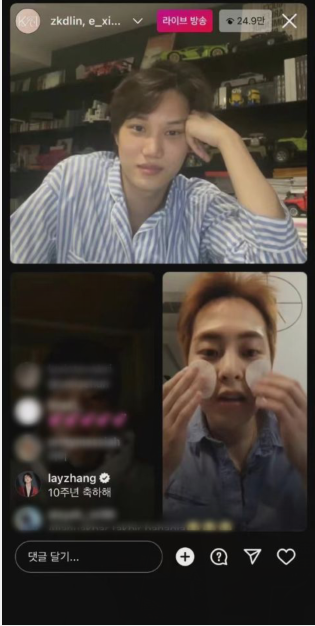 此外,昨晚EXO成员KAI、SUHO和XIUMIN在IG直播时,LAY也有现身评论区用韩文留言:祝贺10周年。