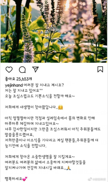 官宣内容中首先问候了所有粉丝,“各位,大家都过的好吗?”又说了一下自己的近况,“我过的很好”,随后说明了今日发文的主要目的,“今天想要和大家传达一个开心的消息,我们好像迎来了一个新的小生命”,之后表达了自己此时此刻的心情,“虽然到现在还觉得惊慌不知所措,在担心和心动之下,每天体会着身体的变化”“虽然是一件值得感激的事情,但同时也对此非常小心翼翼,所以到现在还没有来得及和周围的人说”“个我们一样很期待这个消息的粉丝朋友们,还有周围的朋友们,在更晚之前,想跟你们呢分享这个消息。”最后,孙艺珍表示:“我会好好守护来到我们身边的新生命的,希望各位也能守护好自己生命中珍贵的一切,要健康地生活下去哦”。