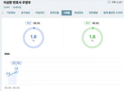 而《非常律师禹英禑》的首播全国收视是0.9%,到了第2集已经翻倍成长。第2集的全国收视为1.8%、首都圈收视为2.0%、最高瞬间达到2.7%,已经创下 ENA 频道自身的最高收视率,在网路上也获得很好的评价。