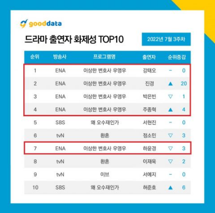 此外,《非常律师禹英祦》在演员榜中也一次上榜了5人!!