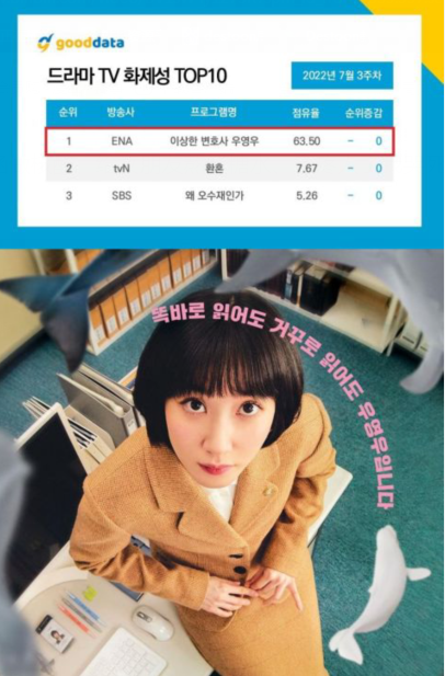 超人气黑马韩剧《非常律师禹英祦》目前已经连续四周夺下GOODDATA电视剧话题性的冠军宝座,数据已经飚升到了历代级的高度,一般20~30%以上就可以视为高讨论度的冠军热门韩剧,但他足足拿到了63.5%的高占比,实力相当惊人!