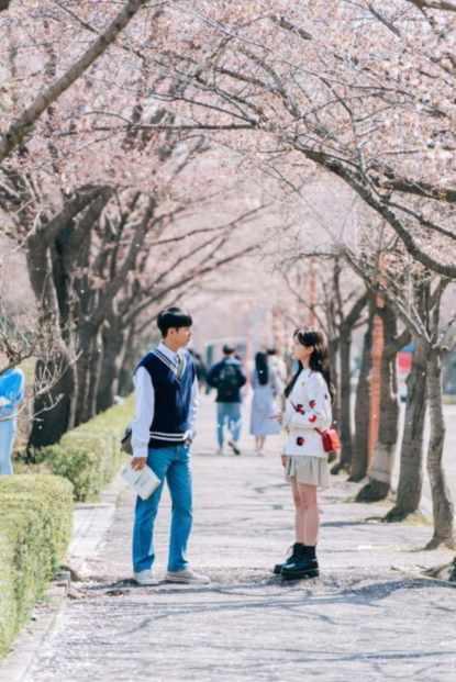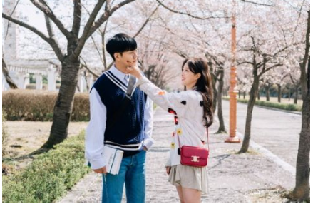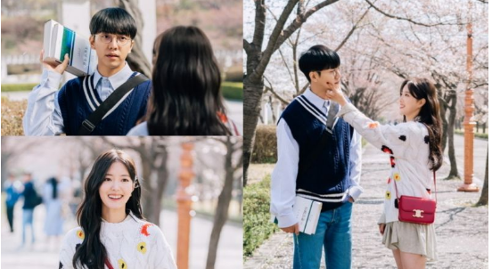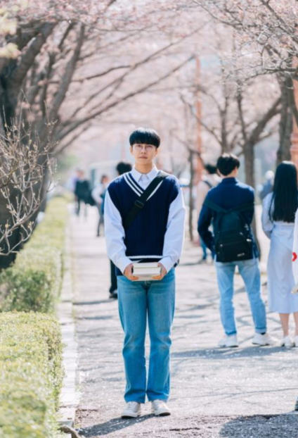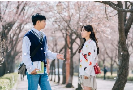 新公开的剧照里,两人回到在韩国大学法学系读书的时期,在学校后门的樱花路进行微妙对话。李升基戴着圆圆的眼镜,抱着一摞专业书籍,不愧是以第一名成绩考入学校。
