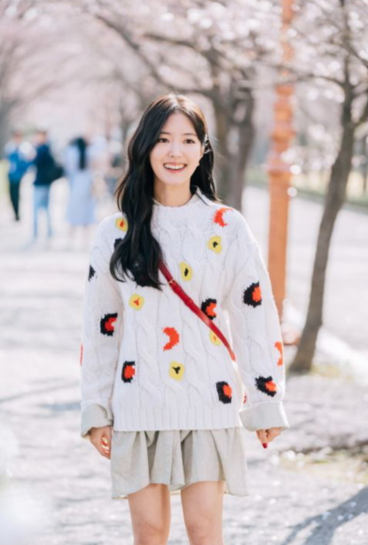 金宥利则是一头浪漫的长卷发,毛衣和短裙活泼又可爱,阳光一般的笑容更展现出校花的清纯魅力。