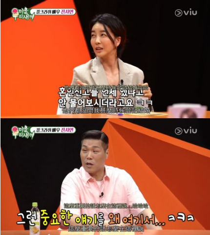 除了产身瘦身话题外,陈瑞妍也大方回答自己和丈夫结婚的过程,表示自己和丈夫交往3个月就火速结婚,虽然处处不满意,但觉得对方是自己的配偶,也承认和丈夫结婚登记2年后才让双方父母知情,现场熊妈妈都相当惊讶,MC徐章勋甚至说:这么重要的事情怎么在这里说?深怕陈瑞妍讲了之后会闹家庭革命。