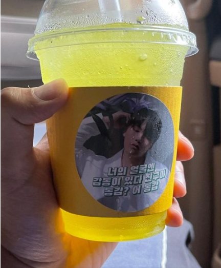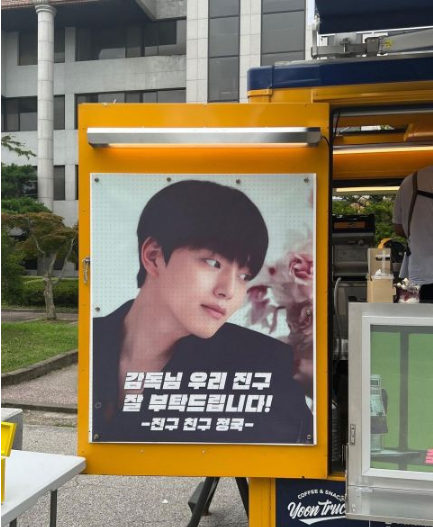 咖啡车上方布条写着提前祝贺吕珍九演员的生日,为电影《同感》的工作人员&演员们应援- BTS柩国-左边的写着导演Nim请多多关照我们珍九,-珍九的朋友柩国右边则写着金勇…已经很帅了贴纸则印着你的脸蛋让人感动!珍九呀同感吗?哦同感。