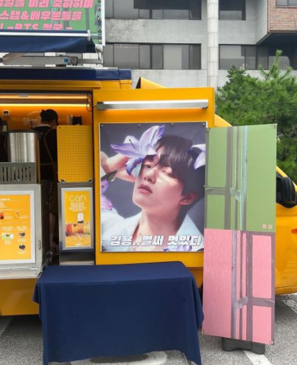 韩网讯/ 7日,BTS防弹少年团柩国为正在拍摄电影《同感》的吕珍九送上了应援咖啡车。