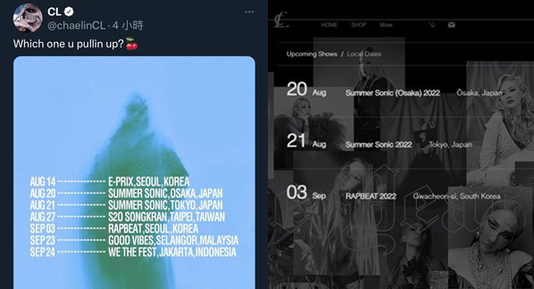 而昨天(17日),CL twitter原本公布的开唱行程表(如下图左)不见了,官网上的行程表(如下图右)也从21日的日本活动直接跳到9月3日在韩国的行程,让大家更加怀疑是否CL已取消来台。