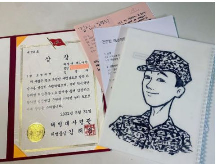 ▼配文写着:学了很多、也感受到很多,健康地渡过了海军陆战队的生活,感谢所有等待着我的人,Part 2开始了。(意指展开人生的第二阶段)照片中也附上了他的奖状和收到的各种物品。