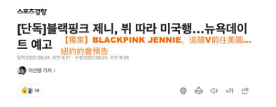 据韩媒《体育京乡》独家报道称两位顶流爱豆前往了同一个地方。24日上午,V经由仁川国际机场飞往美国纽约,而第二天的25日下午BLACKPINK也将前往纽约,成员们结束各自的美国行程后陆续回国。绯闻男女主角相隔一天飞往同一个目的地,很难不让网友浮想联翩,就连韩媒都发散思维地表示纽约约会预告!