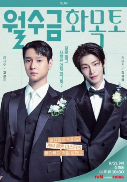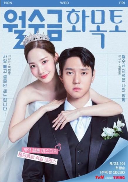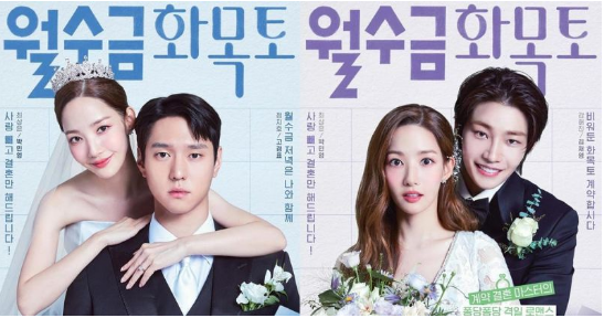 tvN全新水木剧《月水金火木土》(每周三、四播出)公开了三张情侣海报,由朴敏英、高庚杓、金宰永携手主演,各自对这段假婚姻也有话想说。
