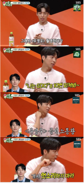 朱钟赫爆料自己每次紧张的时候就会自我催眠,这个方法还是姜其永告诉他的,之前拍照的时候会紧张,其永哥就让我大喊十次'我是GD',这之后每次想要拥有自信的时候我都会照做一遍。