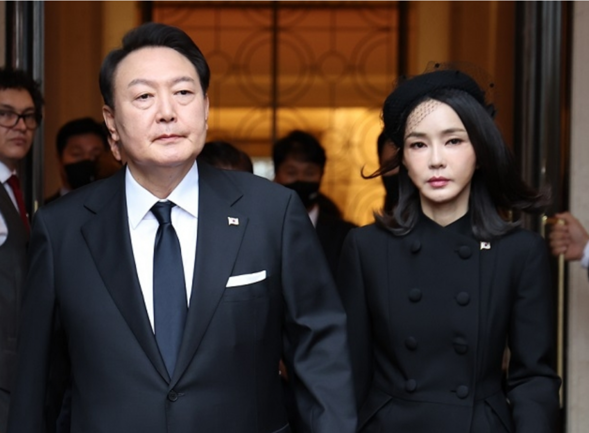 韩网讯/围绕19日(当地时间)与尹锡悦总统一起出席英国女王伊丽莎白二世的葬礼的金健熙女士的"黑色面纱"时尚问题,网络社区等掀起了一场争议。