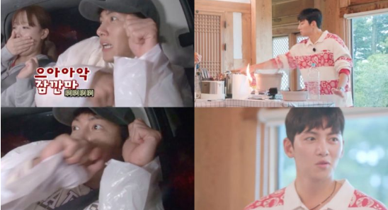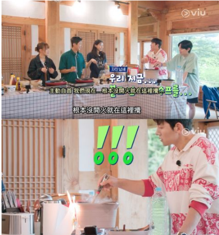 隔天蓝队早起帮大家准备早餐,池昌旭&刘庆秀负责煮汤,两人一开始还没开火就一直搅拌!之后旁边的纸巾还不小心著火,池昌旭反应很快地抓起纸巾灭火,并说著:冷静!冷静!各位~在下厨时,要注意用火!跟昨天看到虫子大声尖叫超反差(笑)!