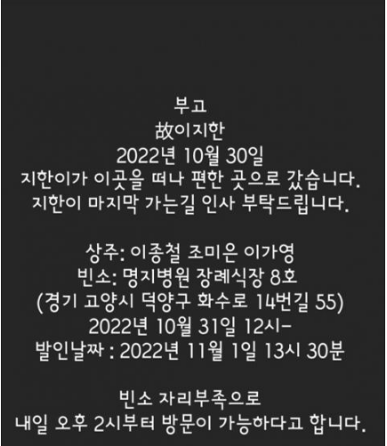 一起出演过节目的朴熙石、金道贤、赵晋亨转发讣闻,写道2022年10月30日 智汉离开了这里去了安详之处,希望大家来送智汉最后一程。并公开他的出殡日选在11月1日下午。随后,他的所属社935娱乐也发出声明。