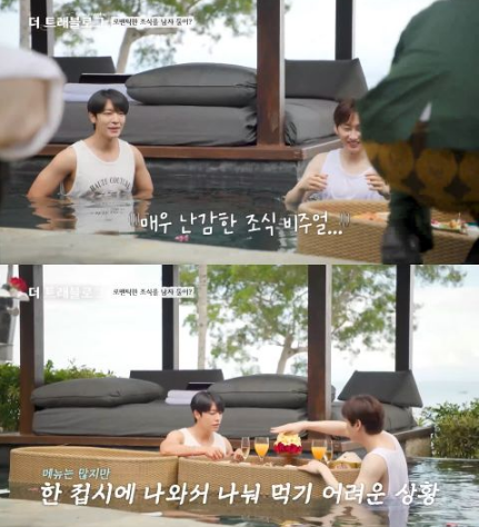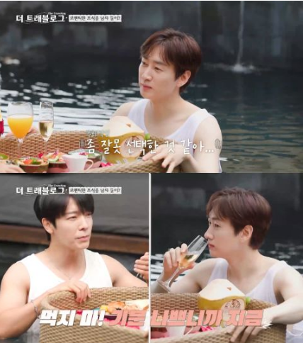 D&E东海与银赫起初还没发现制作组的用意,只觉得峇里岛是个浪漫之地,但享用漂浮早餐(floating breakfast)时就奇怪了,因为是双人餐,餐点用了许多花瓣装饰。两个人一看到就说:不能分开吃吗?两个男人……