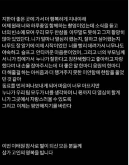 她写下:智汉啊 你要去到好的地方过得更加幸福。昨天原本是你要跟我一起拍摄整天的日子,听到消息后去了你的灵堂,我们所有人都说不出话,只是慌张地坐著。我非常清楚你有多努力、多麽想做好,事故这么快带走刚要开始的你,我感到非常无情、悲伤和惋惜...