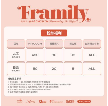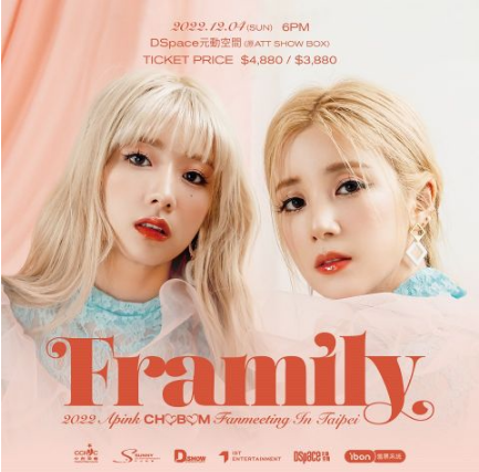 而Framily则是由英文Friend和Family组合而成,象徵初珑、普美的深厚感情好比家人一样的朋友。在之前举行的韩国站见面会,初珑和普美就特别表演了后辈女团NewJeans的《Hype Boy》,令全场Panda非常惊喜!不知道CHOBOM又会为台湾的观众准备什么特别环节,跟Panda们一起留下美好的回忆呢?如希望知道更多 “2022 Apink CHOBOM fanmeeting Framily”的相关资讯,请继续留意D-SHOW的FB和IG更新。