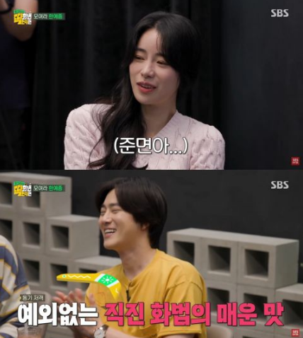 林智妍的直率不止用在学弟李相二身上,还用在同班同学Suho(金俊勉)身上!林智妍原本兴奋的说:出道后在待机室碰到俊勉的时候觉得很神奇,因为他对我来说就是EXO。Suho马上高歌几句,却被林智妍冷不防丢一句:「但俊勉当时没有唱那么好。Suho爽快承认但说:都已经过了10年了……