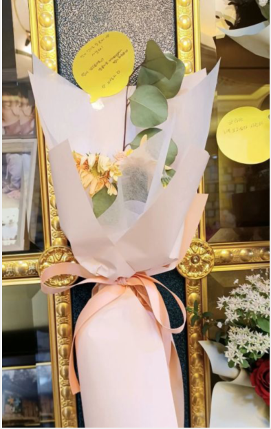 在花束上面贴著一张纸条写著姐姐再见 我会再来的~♡ 我爱你!、想姐姐了!我会再来的 move again 一起度过吧!署名是知英(龄)智。上月24日是具荷拉的忌日,姜知英也在 IG 更新她和忙内许龄智拿著一束花的照片,两人一起去看姐姐了啊。