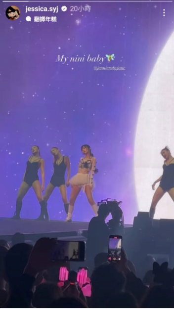 Jessica在15日于个人IG上传BLACKPINK演唱会片段,视频中Jennie穿着火辣,正与舞者进行个人舞台,视频长达25秒,用英文写着My nini baby,显示着两人好感情。