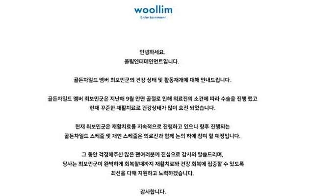 Woollim娱乐表示,崔普闵健康状况大幅好转,正持续进行治疗,但今后进行的Golden Child行程及个人行程将与医疗团队一起进行讨论,视状况回归,与粉丝见面,也感谢大家的支持。