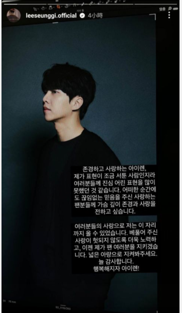昨(18)日下午,李升基以全新形象照为背景,发布了一串文字献给粉丝Airen,韩文版翻译如下:
