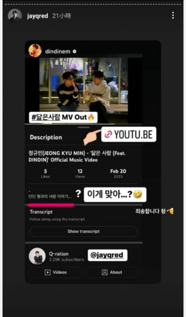 奎敏在自己的频道上传MV,介绍栏很直白的写:和DinDin哥的爱情故事……直接被DinDin抓包、截图发问:这样对吗……?奎敏回应:对不起哥(敬礼)互动相当搞笑。