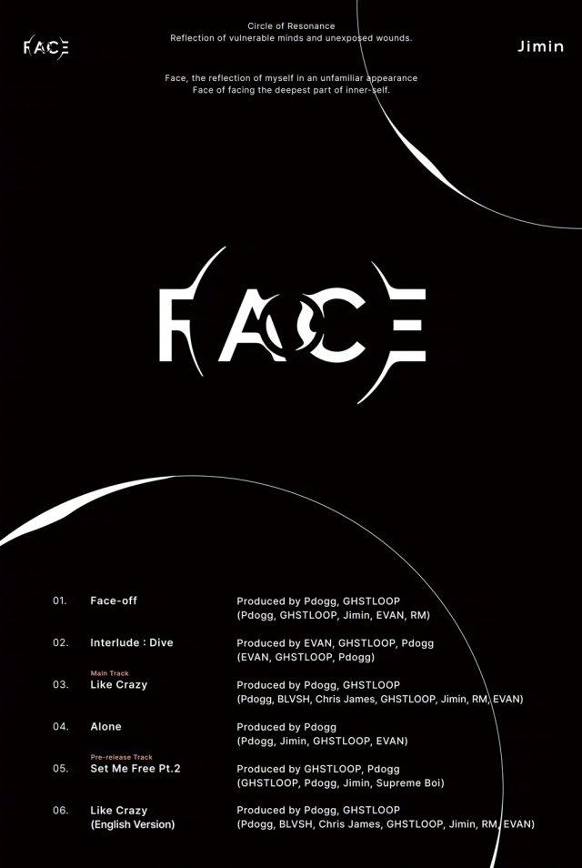 防弹少年团RM、Pdogg、Supreme Boi、GHSTLOOP、EVAN、BLVSH、Chris James等实力派音乐人也参与了《Face》创作,朴智旻也积极参与专辑的制作,融入了自己的色彩。