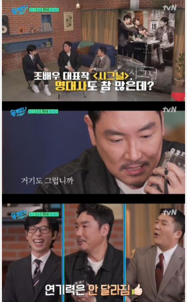 刘在锡表示自己之前也有追看《Signal 信号》,提到了当中的名台词,赵震雄便拿起了对讲机,开始重现对著朴海英(李帝勋 饰)说的这句话:那里也还是如此吗?那么20年都过去了,总是改变了些什么吧!立刻把大家带回了追剧时的感动。