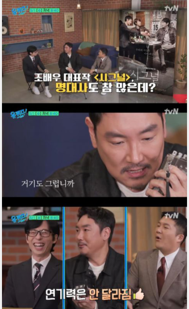 刘在锡表示自己之前也有追看《Signal 信号》,提到了当中的名台词,赵震雄便拿起了对讲机,开始重现对著朴海英(李帝勋 饰)说的这句话:那里也还是如此吗?那么20年都过去了,总是改变了些什么吧!立刻把大家带回了追剧时的感动。