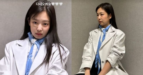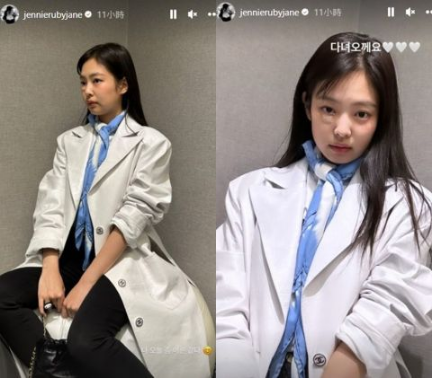 Jennie於6日透过自己的IG story上分享了几张照片,并写著我去去就回〜照片中Jennie穿著全身香奈儿品牌的白色长版风衣,围著浅蓝与白色的渲染领巾,搭配黑色紧身牛仔裤,不愧是人间香奈儿。为了参加时装周而前往法国巴黎,不忘在出发前与粉丝们打招呼。她的右眼下方贴著OK绷,侧面看起来甚至还有点肿,令粉丝们看起来相当心疼。